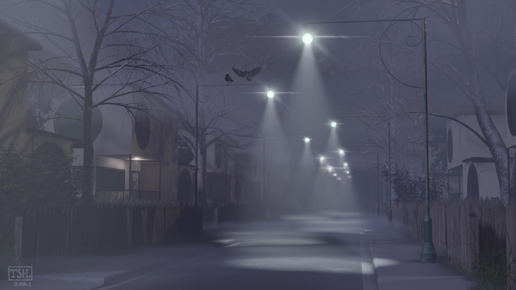 I build the models in Blender, then export to Substance Painter for texturing, then back into Blender with the Botaniq add-on to populate trees/grass and to compose, light and render, then final touches are done with Procreate.